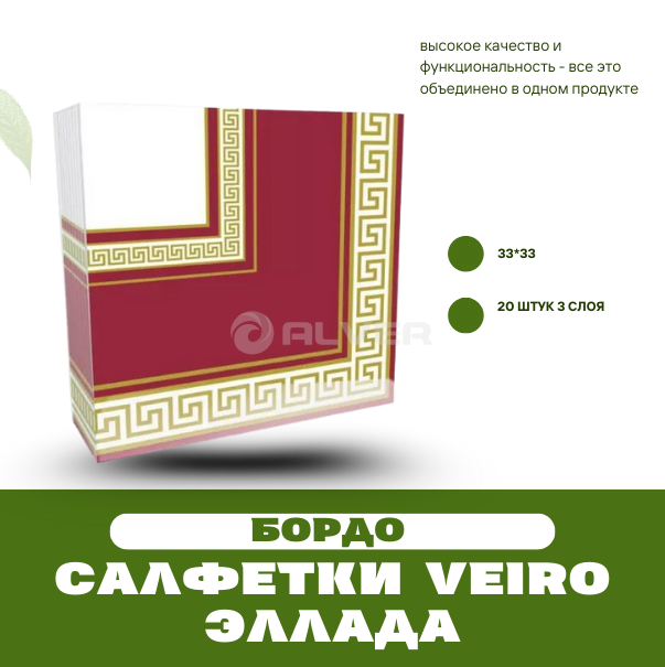 Бумажные салфетки “Veiro Эллада Бордо”. Изысканный дизайн, высокое качество и функциональность - все это объединено в одном продукте. Салфетки изготовлены из трехслойного материала, что обеспечивает их прочность и мягкость. Размер каждой салфетки составляет 33x33 см, что делает их универсальными для любых целей.