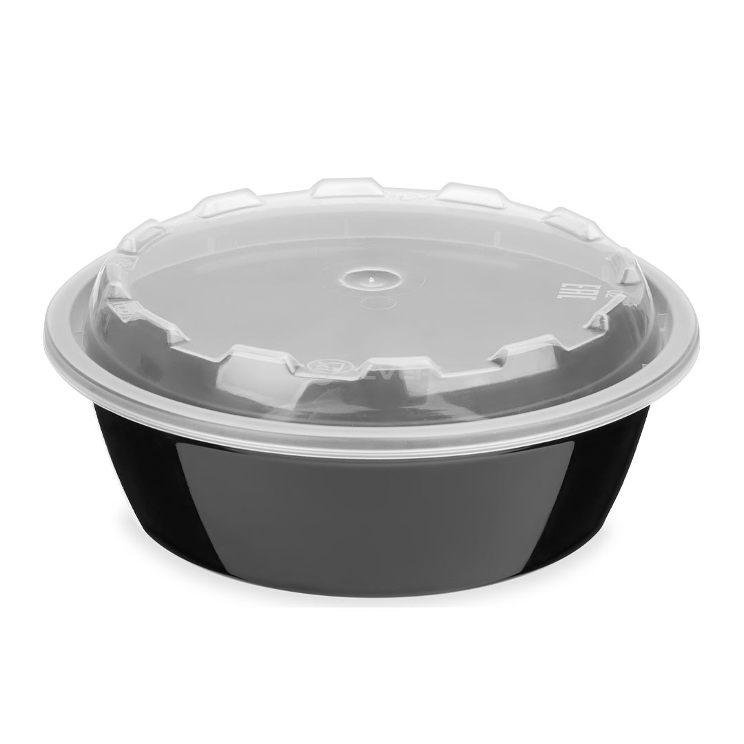Контейнер одноразовый круглый, черного цвета с прозрачной крышкой, объемом 530 мл, размером152х48мм, материал ПП, подходит для холодных и для горячих блюд. Неделимая упаковка 150 шт.