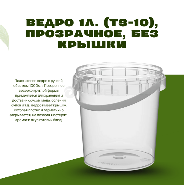 Пластиковое ведро с ручкой, объемом 1000мл. Прозрачное ведерко круглой формы применяется для хранения и доставки соусов, меда, солений супов и т.д. ведро имеет крышку, которая плотно и герметично закрывается, не позволяя потерять аромат и вкус готовых блюд.
