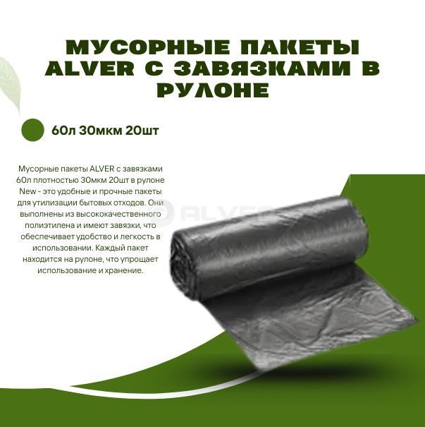 Мусорные пакеты ALVER с завязками 60л плотностью 30мкм 20шт в рулоне New - это удобные и прочные пакеты для утилизации бытовых отходов. Они выполнены из высококачественного полиэтилена и имеют завязки, что обеспечивает удобство и легкость в использовании. Каждый пакет находится на рулоне, что упрощает использование и хранение. Характеристики и качество мусорных пакетов ALVER с завязками 60л плотностью 30мкм в рулоне New делают их оптимальным выбором для использования как в домашних условиях, так и в различных сферах общественного питания. Они обеспечивают безопасную и надежную утилизацию бытовых отходов.